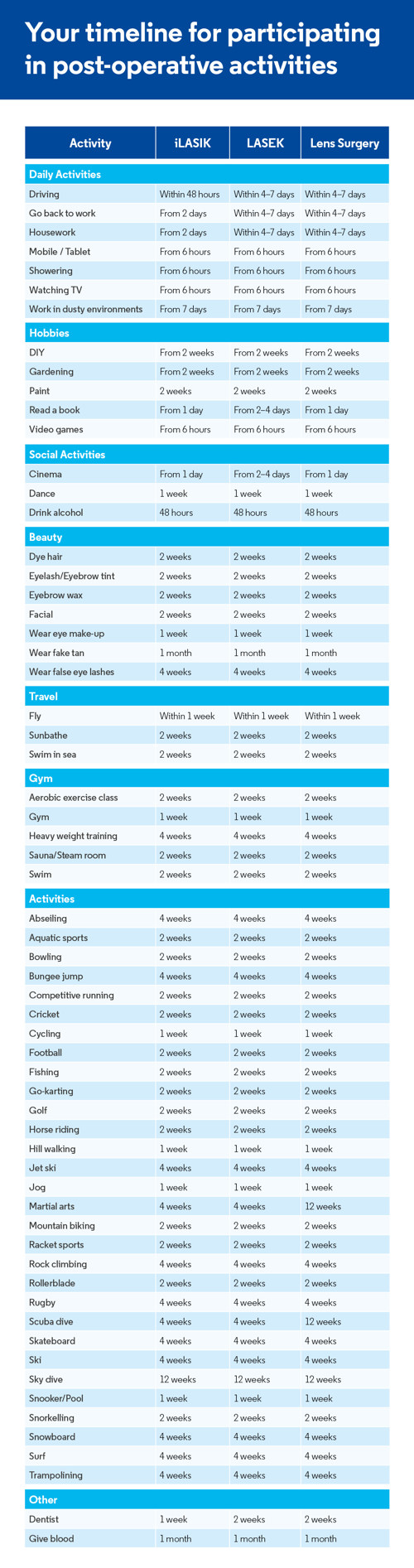 Here is our detailed guide exploring the timeline for participating in post-operative hobbies and activities following a laser eye surgery or lens replacement surgery procedure: