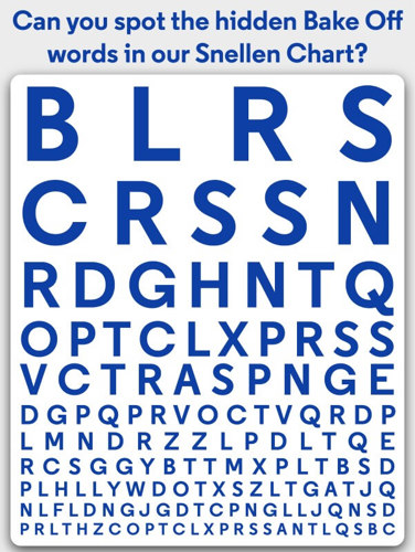 We're challenging Brits with this tricky brainteaser to hunt for a total of eight types of tasty treats, the most famous Bake Off phrase, presenter and judges’ names all hidden within the Snellen chart.